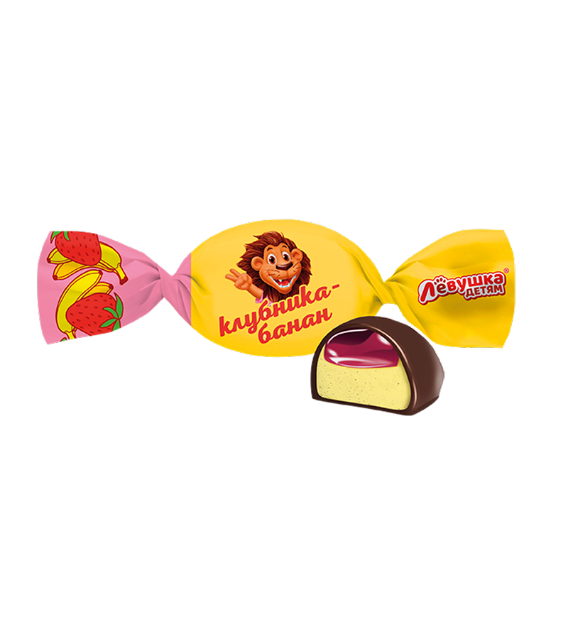 Глазированные конфеты из нежного бананового суфле с желейной начинкой со вкусом клубники.